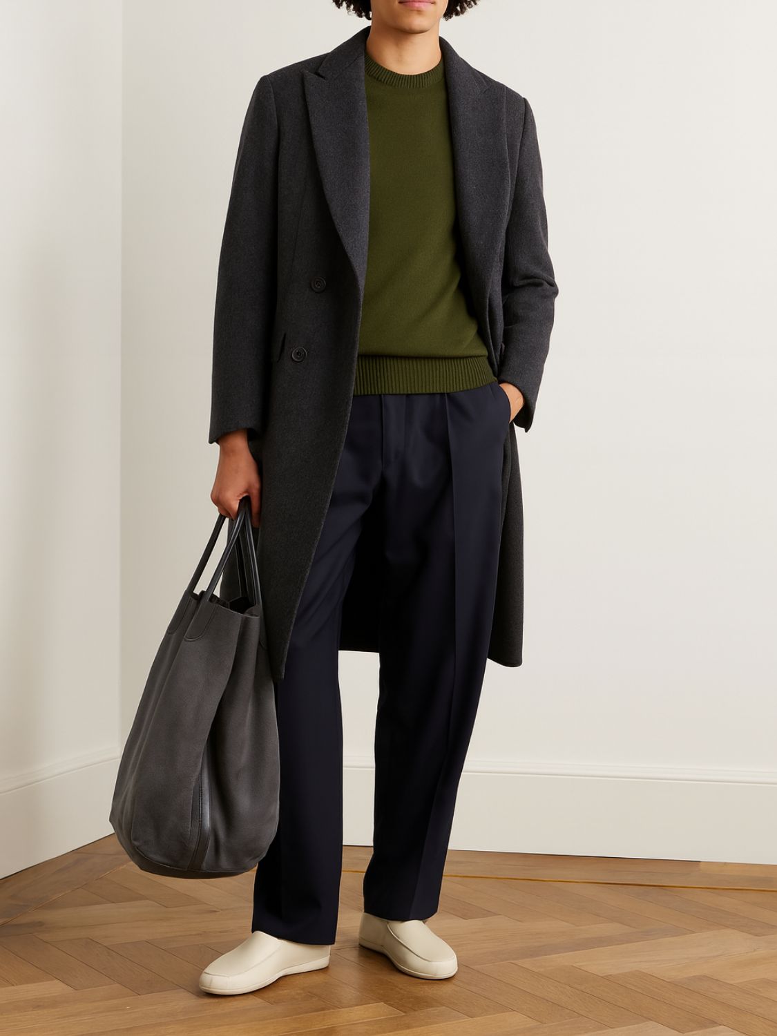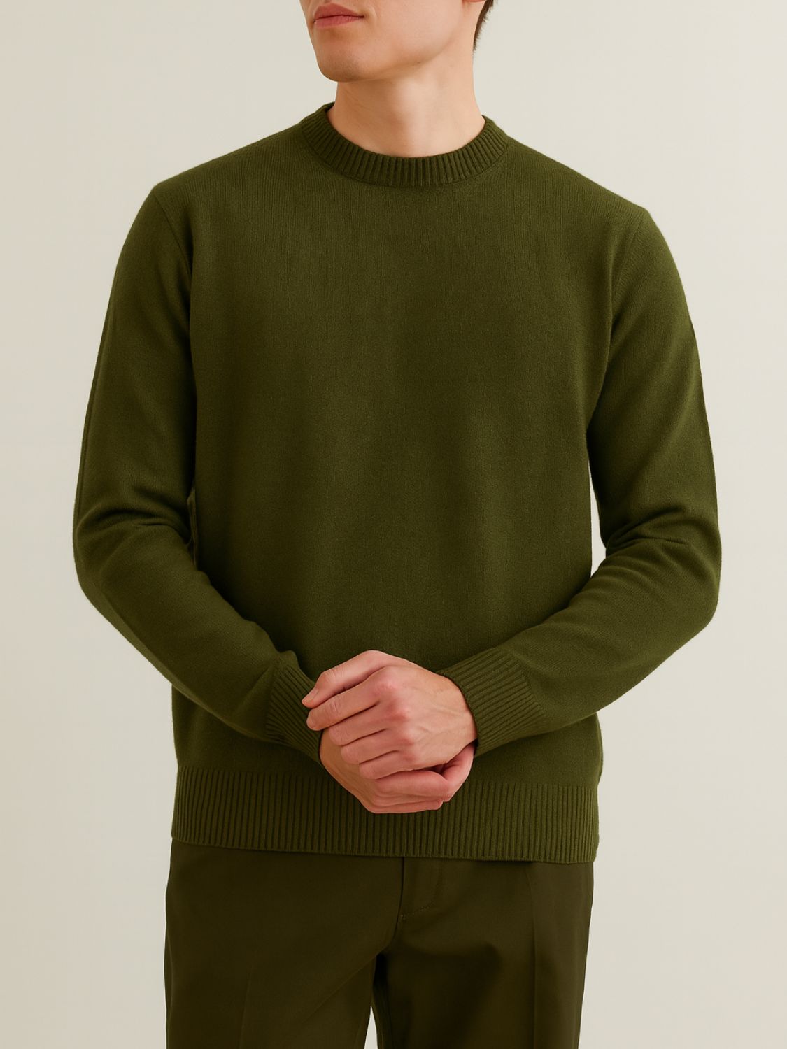 The relaxed silhouette and clean crew neckline create a modern essential that transitions effortlessly from casual layering with denim to sharp tailoring under a coat. In a rich, military-inspired shade, it embodies understated elegance with a utilitarian edge—perfect for the man who values quiet sophistication.