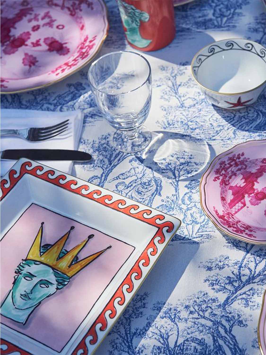 The Il Viaggio di Nettuno collection, was born from a collaboration with the young British designer Luke Edward Hall. Hall's passion for Greek mythology is evident in the series of characters surrounded by Mediterranean decorative elements.