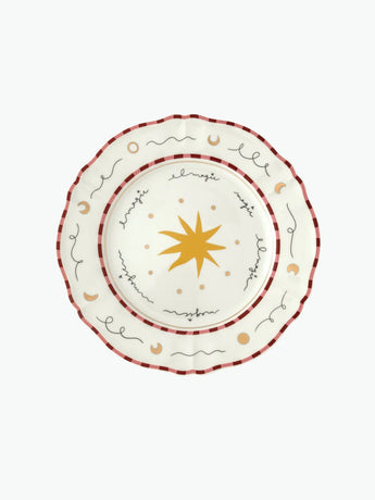 The Bitossi Dinner Plate Star brings celestial charm to your table with its golden star motif and delicate lunar-inspired detailing. Crafted in fine porcelain, this piece beautifully blends Italian craftsmanship with whimsical design, perfect for festive tables or elegant everyday dining. A touch of gold elevates its look, while the red-trimmed edge adds a timeless, decorative accent.