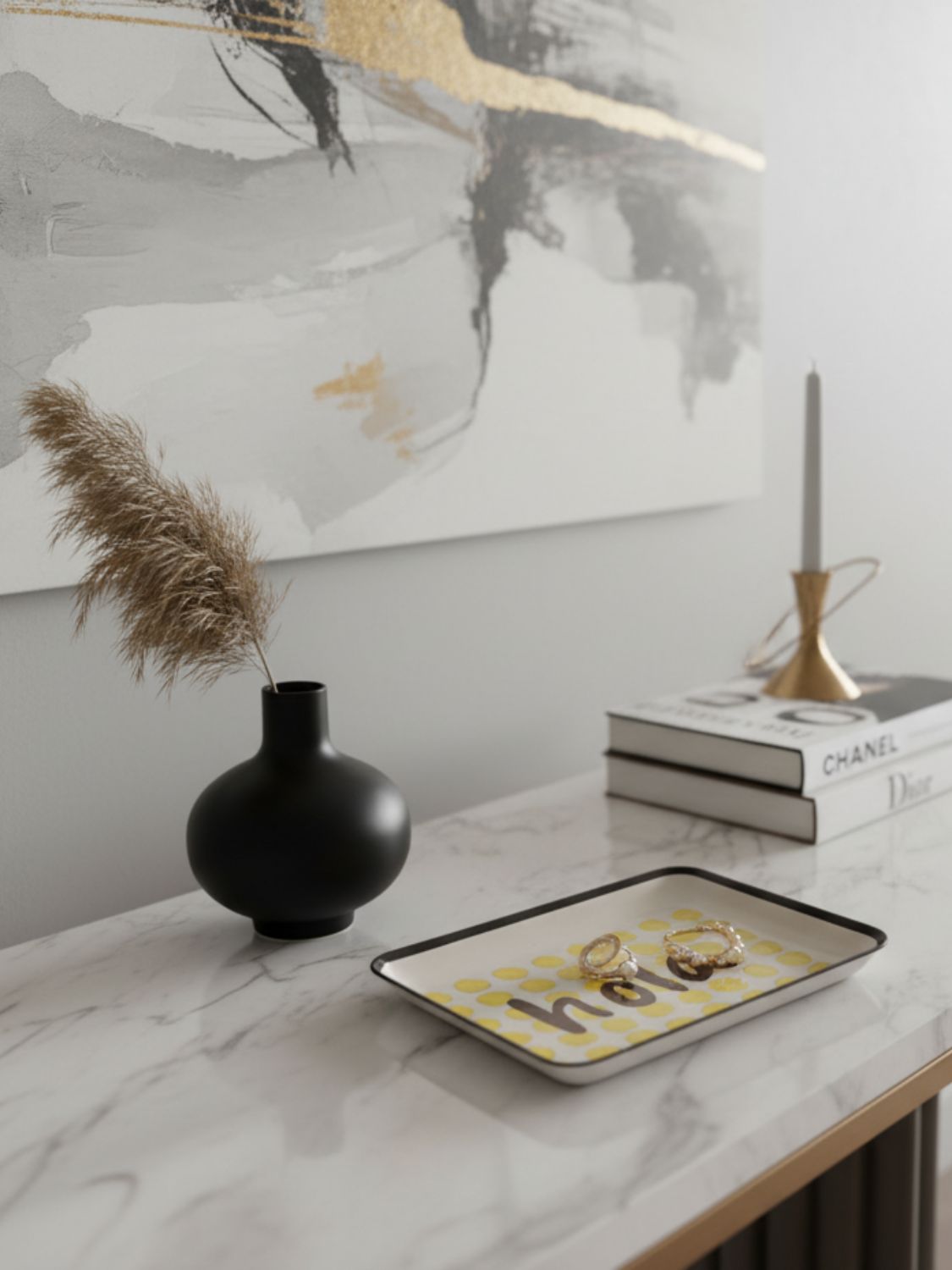 Bring a touch of joyful charm to your home with the Les Ottomans Hola Hand-Painted Tray. Handcrafted from durable iron, this vibrant piece features a bold Hola motif surrounded by playful golden dots, an uplifting invitation to gather, celebrate, and share good vibes.
