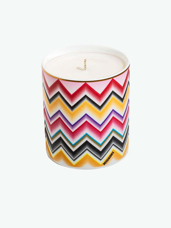 Introducing Marrakech, the latest addition to Missoni's diverse range of candles, offering a multisensory experience. Housed in a fine bone china container adorned with the brand's iconic zigzag motif in vibrant shades of red, yellow, purple, fuchsia, orange, and black, this candle serves as both a visual delight and a fragrant treat. The container can be repurposed once the wax has burned out.