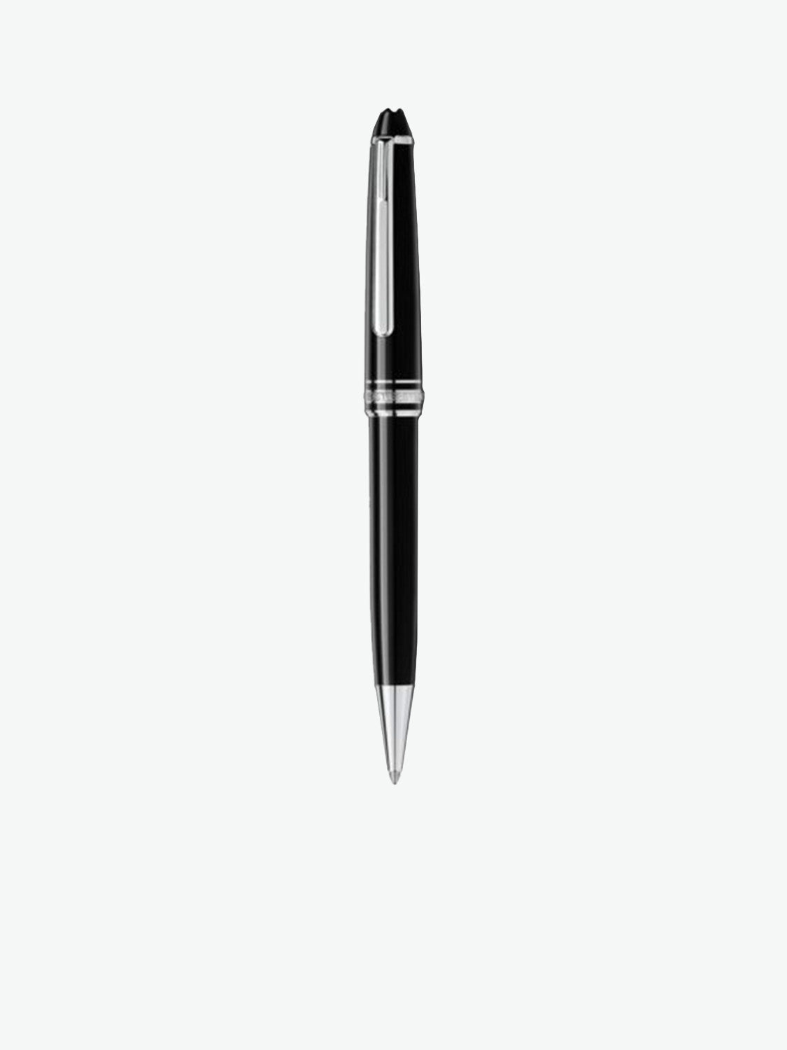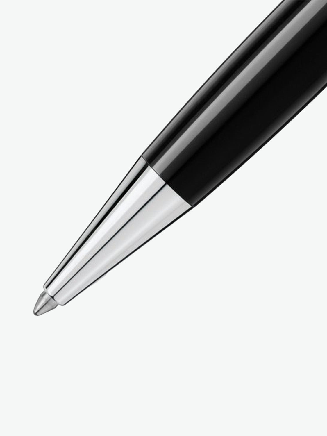 Montblanc's Meisterstuck classique luxury ballpoint pen epitomizes a distinctive design icon. The cap and barrel are crafted from precious black resin, inlaid with the iconic white Montblanc emblem. Three platinum-coated rings with embossed Montblanc lettering and a platinum-coated clip with an individual serial number highlight the timeless elegance of this exquisite writing instrument.