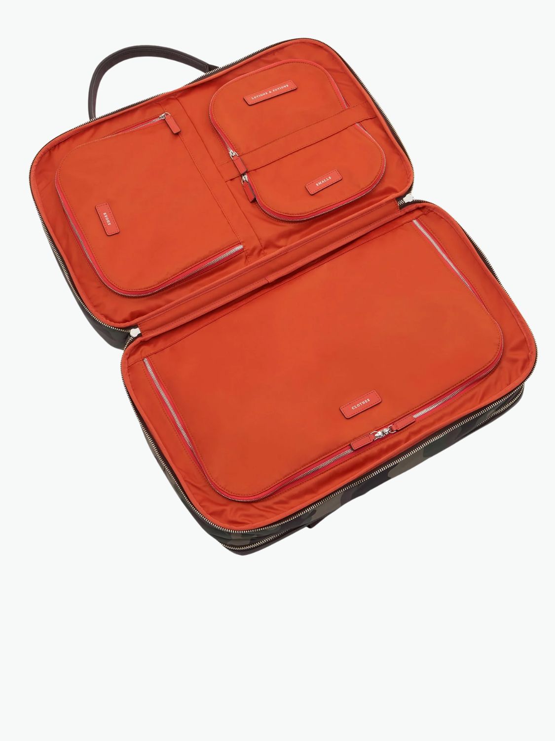Keep "Important Things" in the designated pouch on the sleeve, so that whether you attach the bag to a trolley case or carry it cross-body, these items are within easy reach. Store your passport and phone in the "Journey Essentials" pocket at the front. Inside, it is divided into two main sections, personal and business. Clothes, smalls, shoes, and cosmetics are stored in their dedicated compartments on one side. At the same time, earphones, cables, and other essentials can be organized into labeled pockets, with a padded sleeve for your laptop – all readily accessible, allowing you to work efficiently on your flight or train. Once fully packed, it's easily toted around on your shoulder via the generously sized top handles.